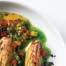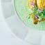 Pečené krůtí stehno, hráškové rizoto s cuketovým pyré s bazalkou a smetanová pěna 216