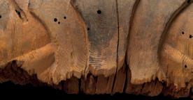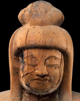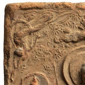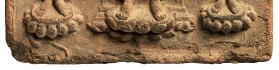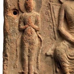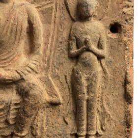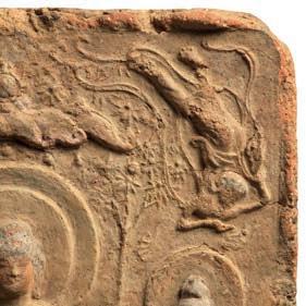 : Na této vyřezávané dlaždici z období Asuka Buddhu doprovází dvojice bódhisattvů.