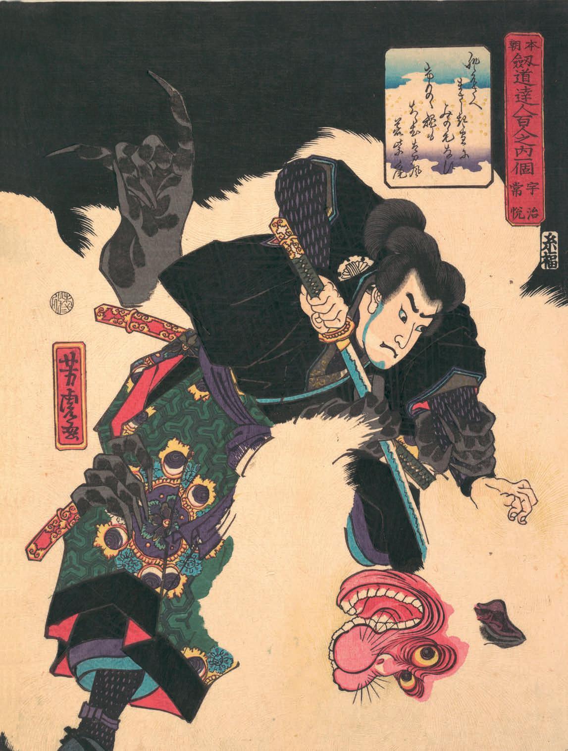 Na tomto dřevotisku, který vytvořil umělec Jošitora Utagawa, válečník zabíjí obrovského bílého lidoopa.