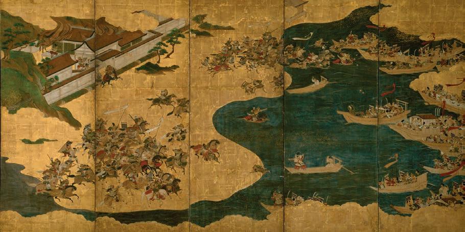 : Na této skládací zástěně je zachycena scéna z bitvy oJašimu, jak je popsána v Příběhu rodu Taira , epickém líčení války Genpei.