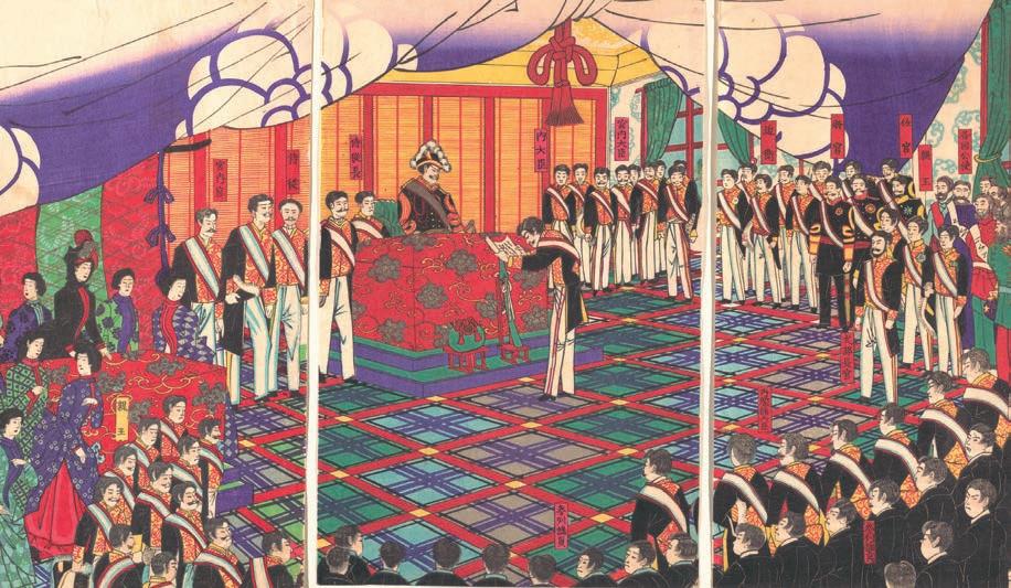 tisk, jehož autorem je Kunitoši Baidžu (1847–1899), zachycuje vyhlášení Ústavy Meidži.