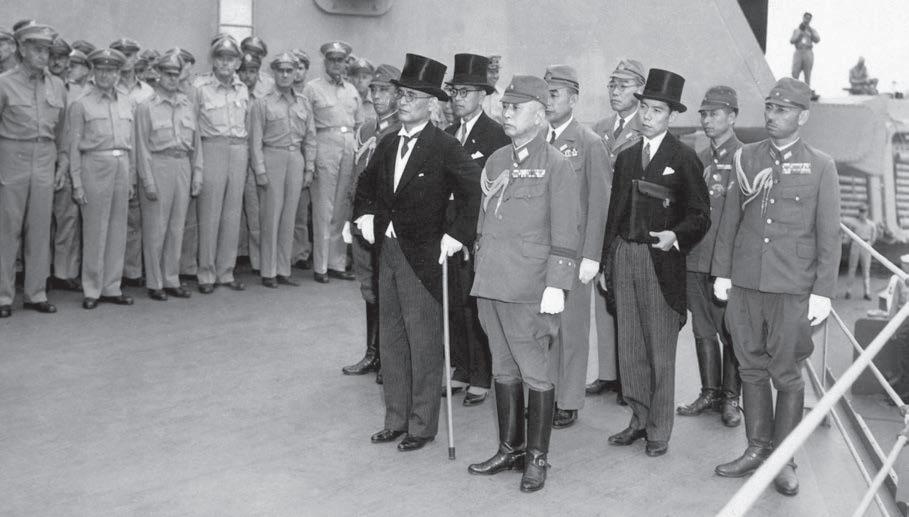 : Zástupci Japonska, kteří se účastnili vyhlášení kapitulace své země na palubě americké bitevní lodi Missouri vTokijském zálivu 2.září 1945.