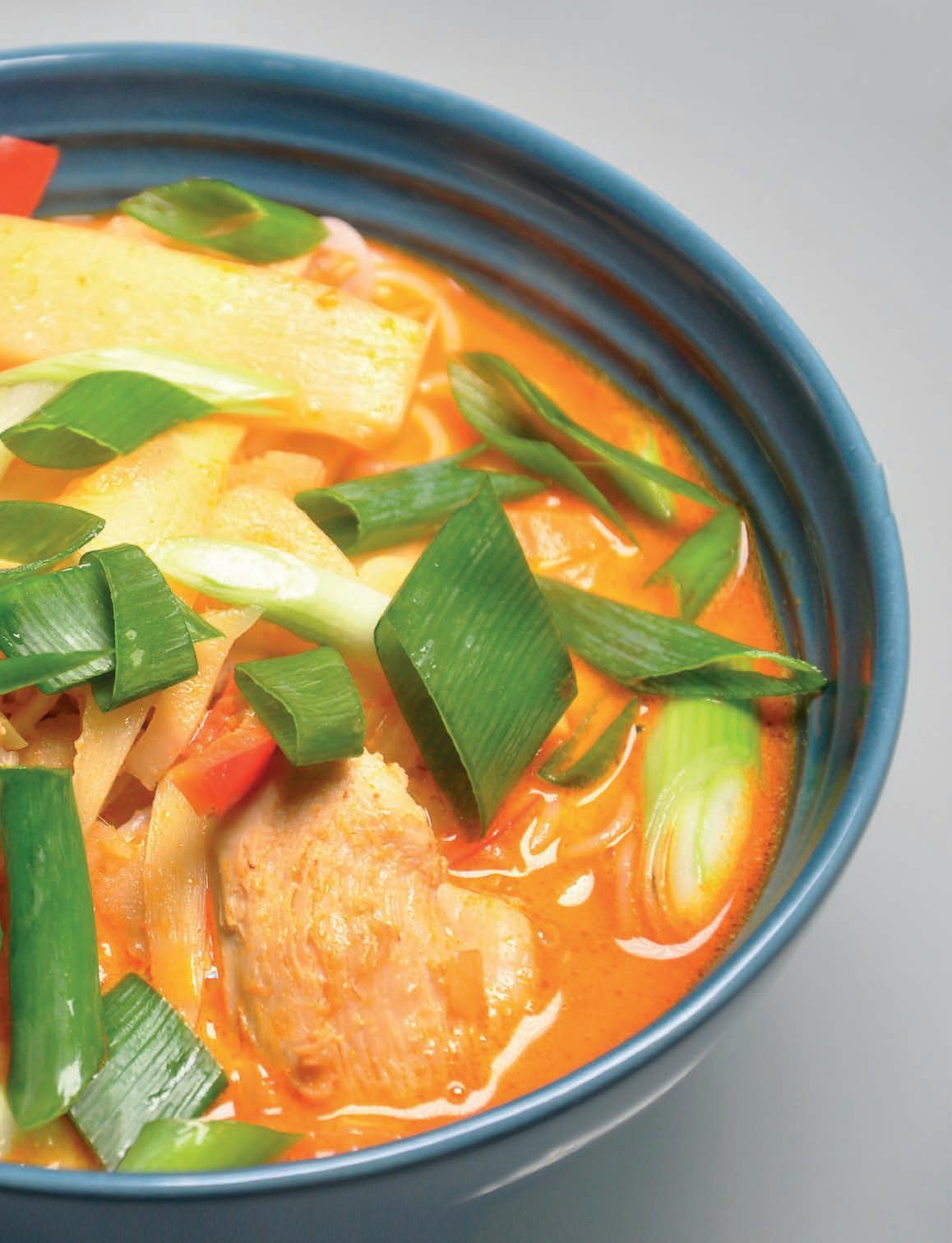 8. Nakonec polévku dochutíme limetovou šťávou. Do misek rozdělíme uvařené nudle, zalijeme je polévkou a ozdobíme jarní cibulkou a bylinkami.