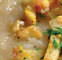 Můžeme podávat. Dáme do talířů, dozdobíme osmaženým pečivem.
