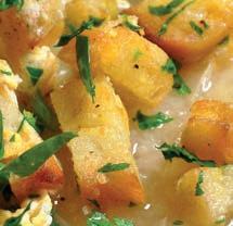 5. Mezitím nakrájíme pečivo na kostičky. Na pánvi rozehřejeme máslo a pečivo opečeme dozlatova. Na pečivo vyklepneme vajíčko, osolíme a opepříme a necháme srazit. Samozřejmě mícháme. Nakonec posypeme nasekanou petrželkou a dáme stranou.