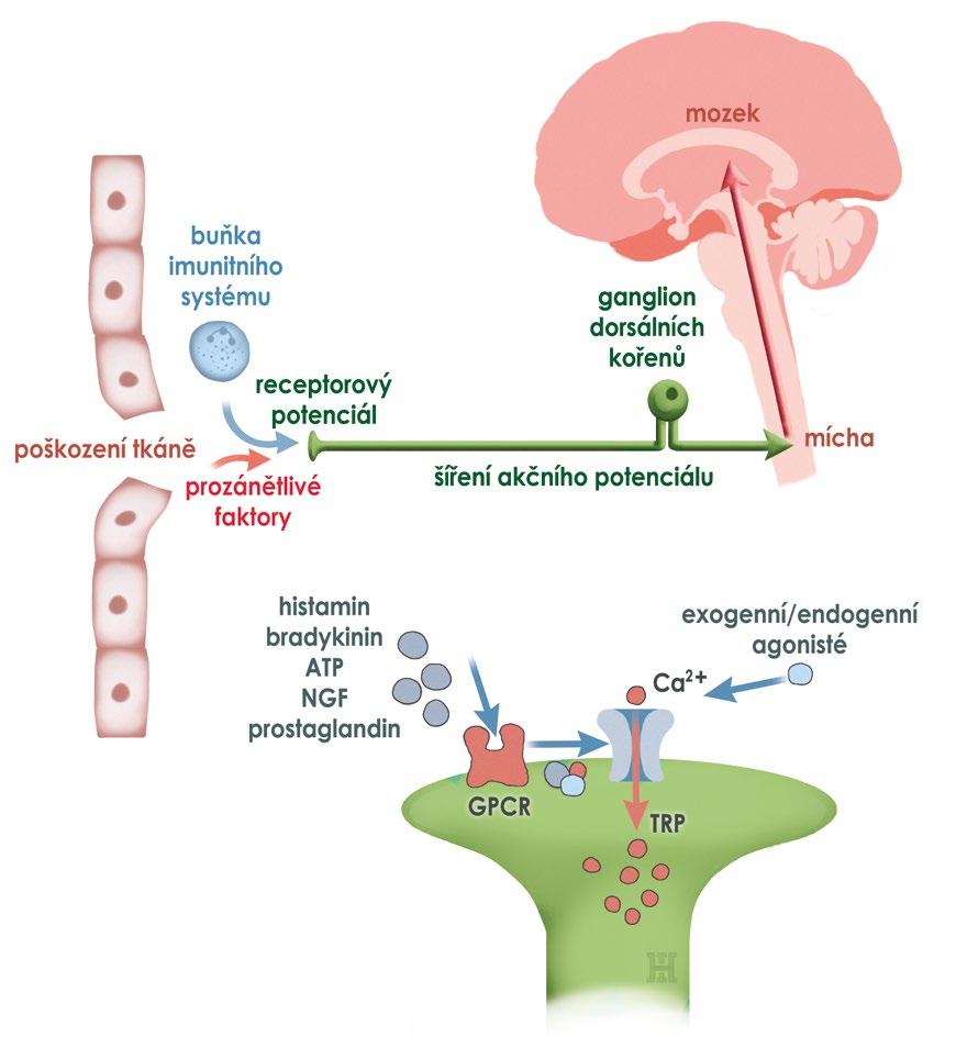 V reakci na aktuální nebo potenciálně škodlivé chemické, mechanické nebo tepelné podněty impulz bolesti přenášejí dva typy primárních aferentních nociceptorů, Aδ- a C-vlákna do dorzálního rohu míchy a vzestupných korových drah do mozku. Pokud je překročen práh bolesti při poškození tkáně, zvyšuje se periferní citlivost na následné podněty. Senzitizace je pouze dočasná, pokud jsou bolestivé impulzy krátkodobé, nicméně trvalá přítomnost podnětů a následná senzitizace může způsobit změny periferních nervů a centrálního nervového systému.