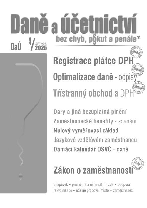 Jaká témata na Vás čekají na stránkách našich dalších měsíčníků? V Poradci 7-8/2025 je uveřejněn Zákon o dani z příjmů po novele s komentářem, v DaÚ 4/2025 Registrace plátce DPH, v DÚVaP 5-6/2025 Automobil v podnikání, v 1000 řešení 3-4/2025 Daňové výdaje, ZDP po novele.