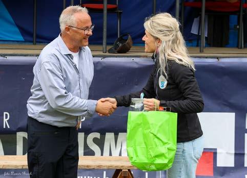 Sarie ontvangt uit handen van voorzitter Coos Veltman een bos bloemen nadat ze toetreedt tot het bondsbestuur van de KNKB