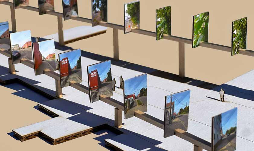 The frames depict the pedestrian's visual experience using photography at a given moment. It’s also a portrayal of the sidewalks' disturbance of vegetation and trash on two sides of the road. The bases boundaries are also outlines of buildings along the site and The inclination of the base is a design approach.