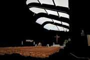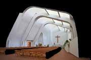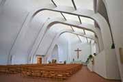 “Upon entry into Riola Parish, a visitor encounters the side entrance of the Parish with graceful stair decline. once through the door, the person will experience the simplicity of the forms, yet it’s so intricate. The audience’s eye will be glued to the unorthodox usage of columns that have an uncanny resemblance of a rib cage. the discrete curves from the wavelike gesture that can be seen from the outside will disappear once inside. The seamless transition with the window panes are another highlight of the building. lastly the stairs for the choir have have another unorthodox approach, with the stairs being different widths and lengths.”