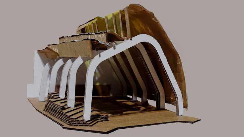 This Model, which abstracts the tectonic assembly of the building to its most essential relationships via materiality limits. The Riola parish expresses how these parts come together to form a whole. What are the most essential relationships that are the rib and the roof acting as a shell. characterize its composition, are the relationships between discrete structural elements.A single sentence that characterizes the most essential relationship in your building’s composition of parts.