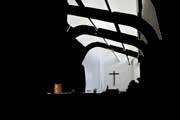 The landscape along the parish also influenced the slow dwindlving walls towards from the front entrance to the parish ending at the preist seat. the princple behind the wave like structure is also a constant increase of the form, however with the same angle from the beam to the window plans.