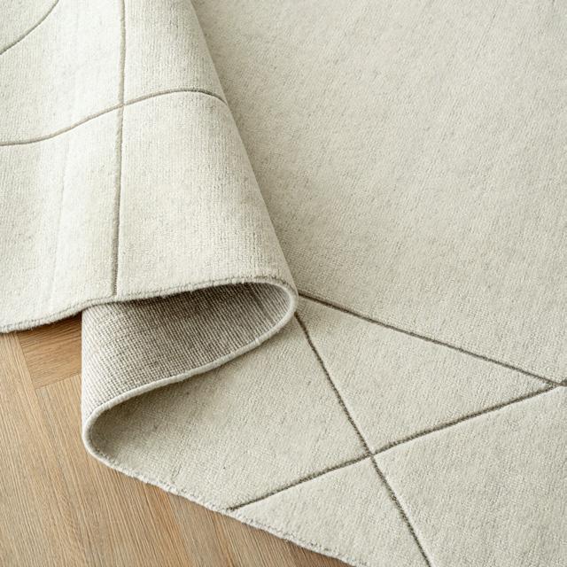 This grey and cream carpet expertly combines a modern aesthetic with a luxury feel. Made from wool, cotton and bamboo, the soft carpet has lines carved into the pile to create the geometric design.