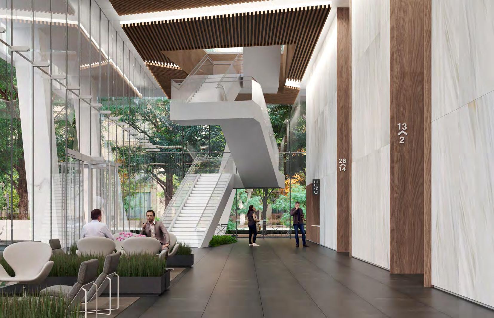 • Dramatic two-story lobby with elevated coffee and wine bar experiences, opening up to the park