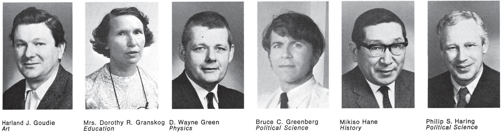 Favorite Professors: Philip Haring managed to both inform and harrow my mind at the same time. Henry Houser was always a kind man; I never left his office without a pile of books he loaned me to read. Jon Wagner taught me that anthropology does not have to be about dead people. Mikiso Hane’s love of learning was so infectious. Rodney Davis exemplified a kind of scholarship I aspired toward — questing, challenging, absolutely open to possibility. Herbert Priestley’s physics courses for non-science majors gave me a foundation I use and appreciate every time we see something important in space. How he must have loved the Hubble and Webb Space telescopes!