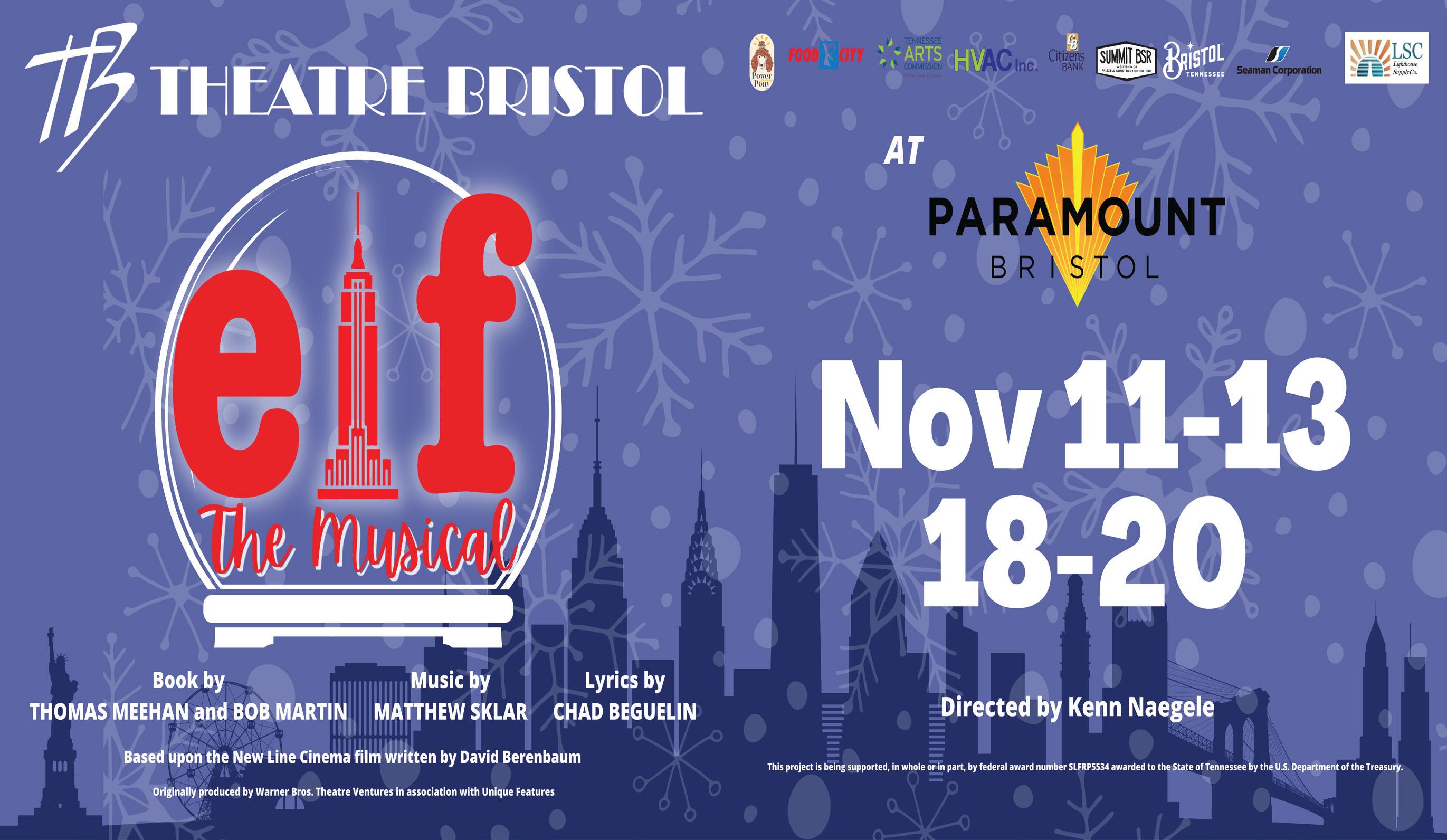 Theatre Bristol is pleased to present Elf The Musical as part of its familyfriendly 57th season of ARTspace and The Paramount Center for the Arts shows, including Twelfth Night, Three Times Three, Jack and the Beanstalk, The Sound of Music, The Legend of Sleepy Hollow radio drama, PLAYtime in the ARTspace weekly, and The StART of Adventure Summer Camp.