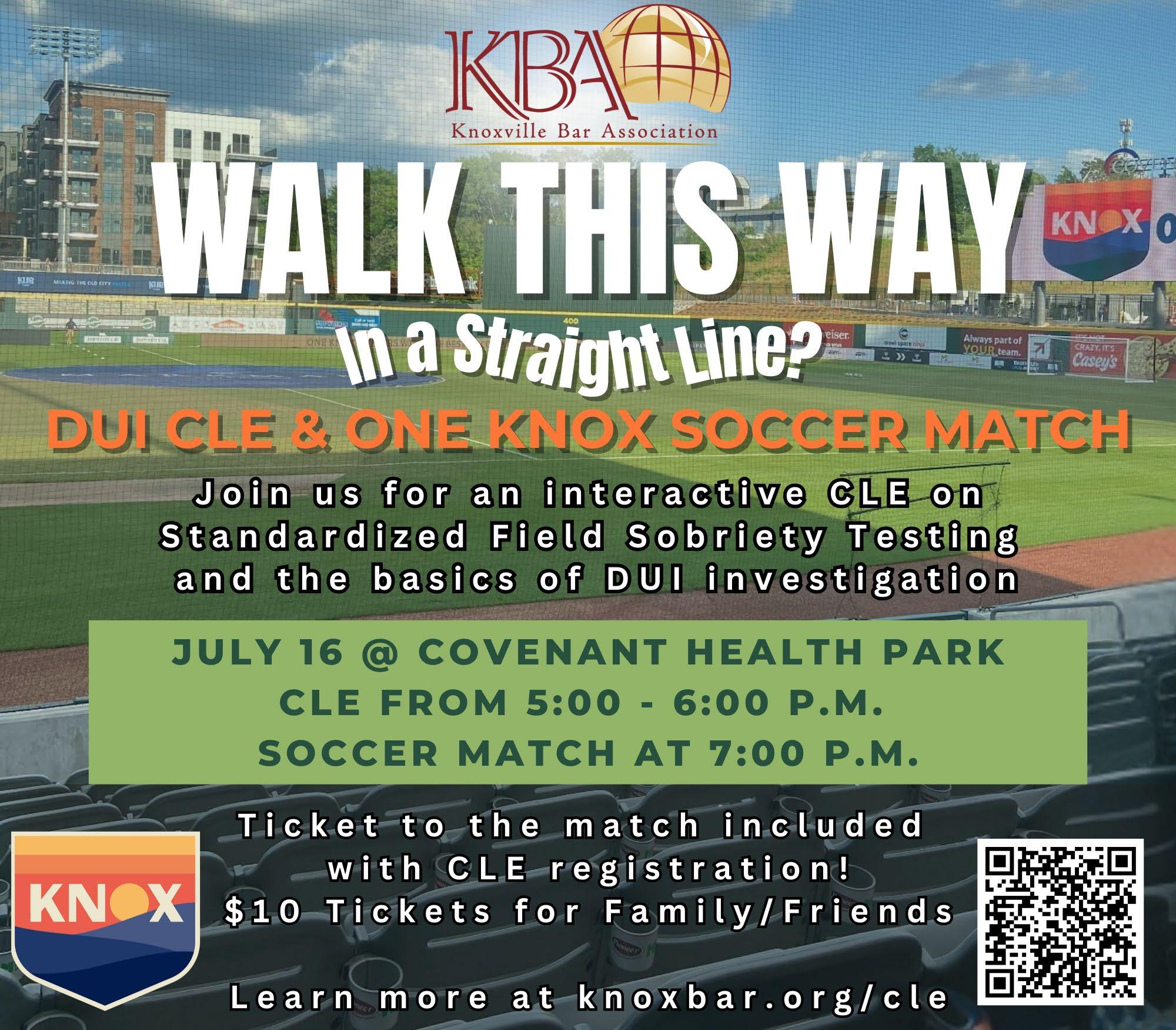 Walk This Way (In a Straight Line?): DUI investigation & Standardized Field Sobriety Testing Wednesday, July 16 | 5-6 p.m. CLE | 7 p.m. One Knox Soccer | Covenant Health Park