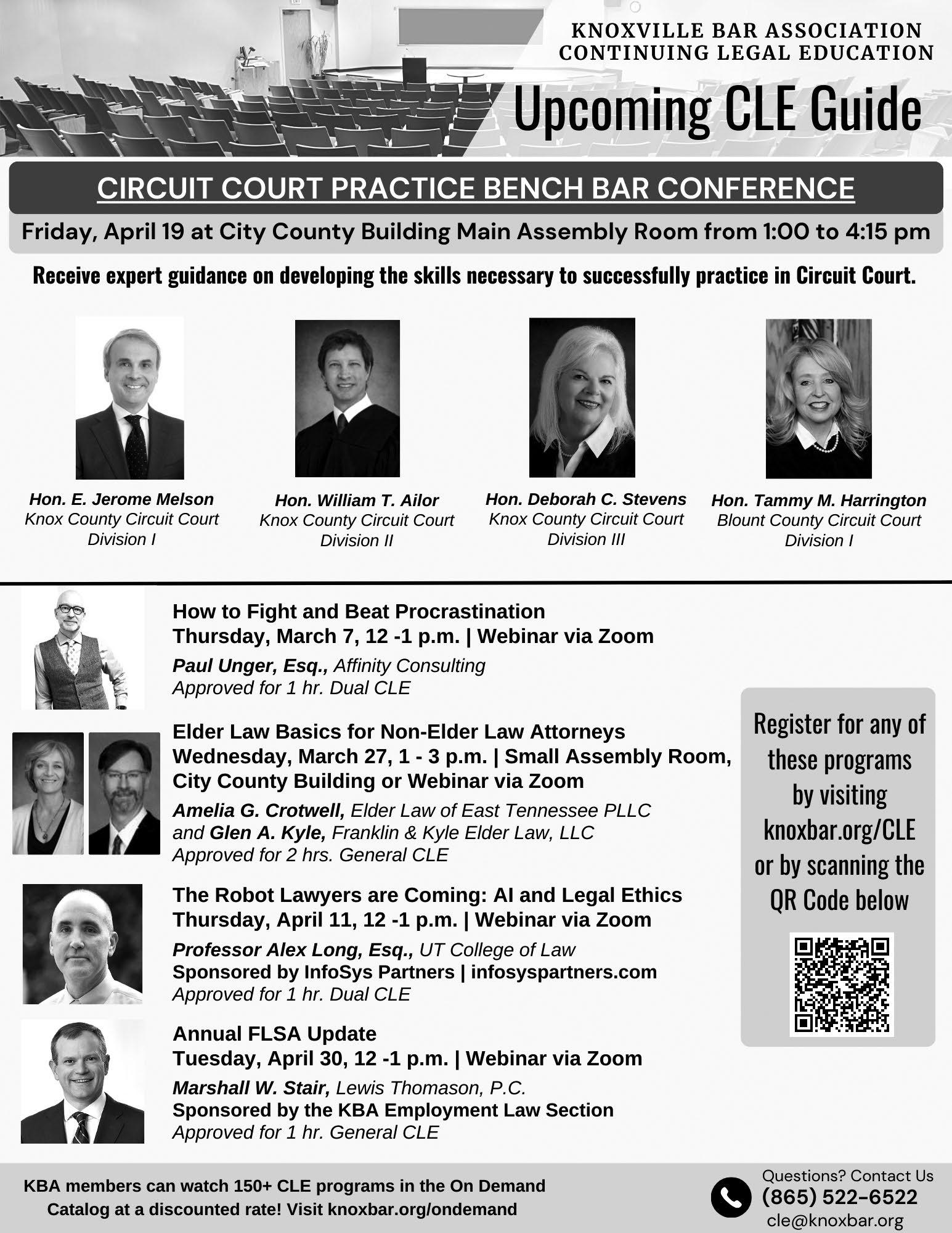 I am proud to be a member of the Knoxville Bar Association, which is—at its core—a service endeavor. Staff and volunteer attorneys meticulously select and secure speakers who can deliver relevant continuing legal education programs, like the “The Robot Lawyers are Coming: Artificial Intelligence and Legal Ethics” CLE program on April 11. They find venues and plan engaging social events that bring us together, such as the Family Law Section Social on March 8. Our collective service, however, goes beyond the Knoxville bar and impacts the profession across the state. The work of the Professionalism Committee led by Chancellor John Weaver and attorney James Stovall2 is a case in point. In fact, in an order dated January 12, 2024, the Tennessee Supreme Court expressly recognized comments submitted by the KBA (i.e., recommendations from the Committee) in “declin[ing] to adopt the proposed amendments . . . to Tennessee Supreme Court Rule 9, section 16.”3