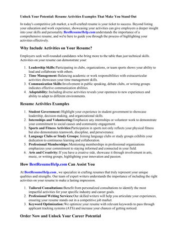 How BestResumeHelp.com Can Assist You At BestResumeHelp.com , we specialize in crafting resumes that truly represent your unique qualities and strengths. Our team of expert writers understands the importance of including the right activities on your resume to make a lasting impression. 1. Tailored Consultations: Benefit from personalized consultations to identify the most impactful activities for your specific industry and career goals. 2. Professional Writing Services: Our skilled writers will help you articulate your experiences, ensuring your resume stands out in a competitive job market. 3. Keyword Optimization: We optimize your resume with relevant keywords to pass through applicant tracking systems (ATS) and increase your chances of getting noticed.