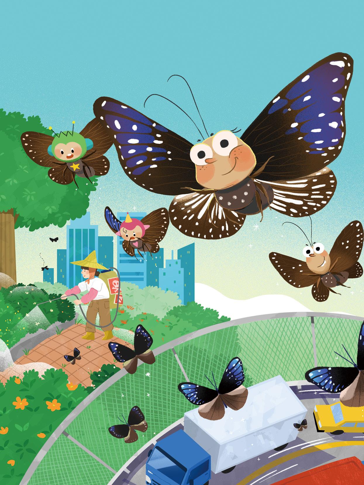 今天是紫斑蝶伊芙第一 次跟著家族展開冒險之旅, 芙蝶長老告訴紫斑蝶們:「這 場旅程是對每隻紫斑蝶的考 驗,只有最勇敢的蝴蝶能成 功抵達傳說中的紫蝶幽谷!」