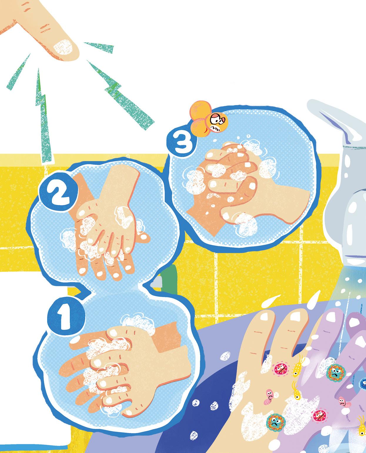 ● 「洗手了沒?」媽媽又說了這句 話,我的手上有什麼呢?只有不 小心畫到的蠟筆線啊!為什麼老 是叫我去洗手呢?不洗手會發生 什麼事嗎?