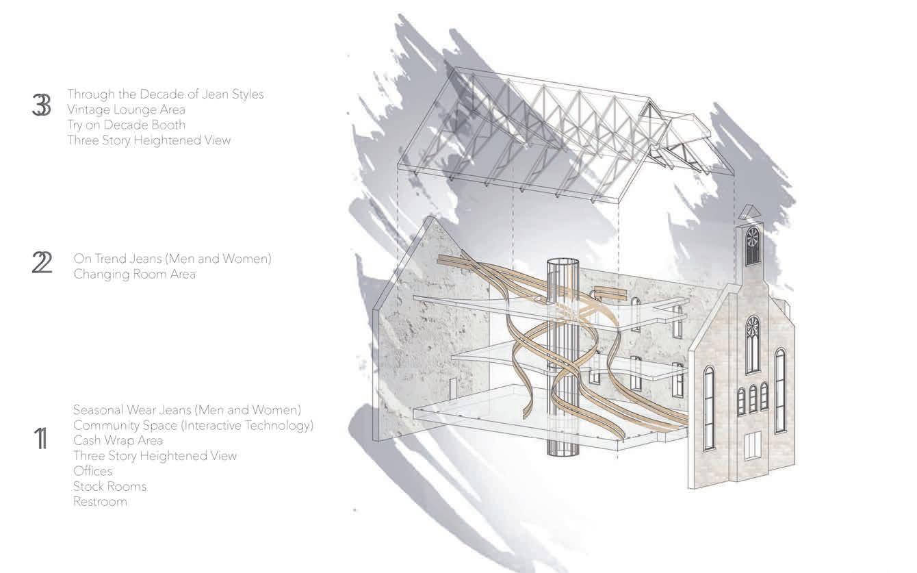 Frayed is a jean store located in New Hope, PA. The concept revolves around the history of jeans through the extensibility of denim fabric. Overtime the fabric starts to fray and become stretched out. The curved forms represent the idea of distressing solid structures within the space and overall show the imperfections of beauty through jeans.