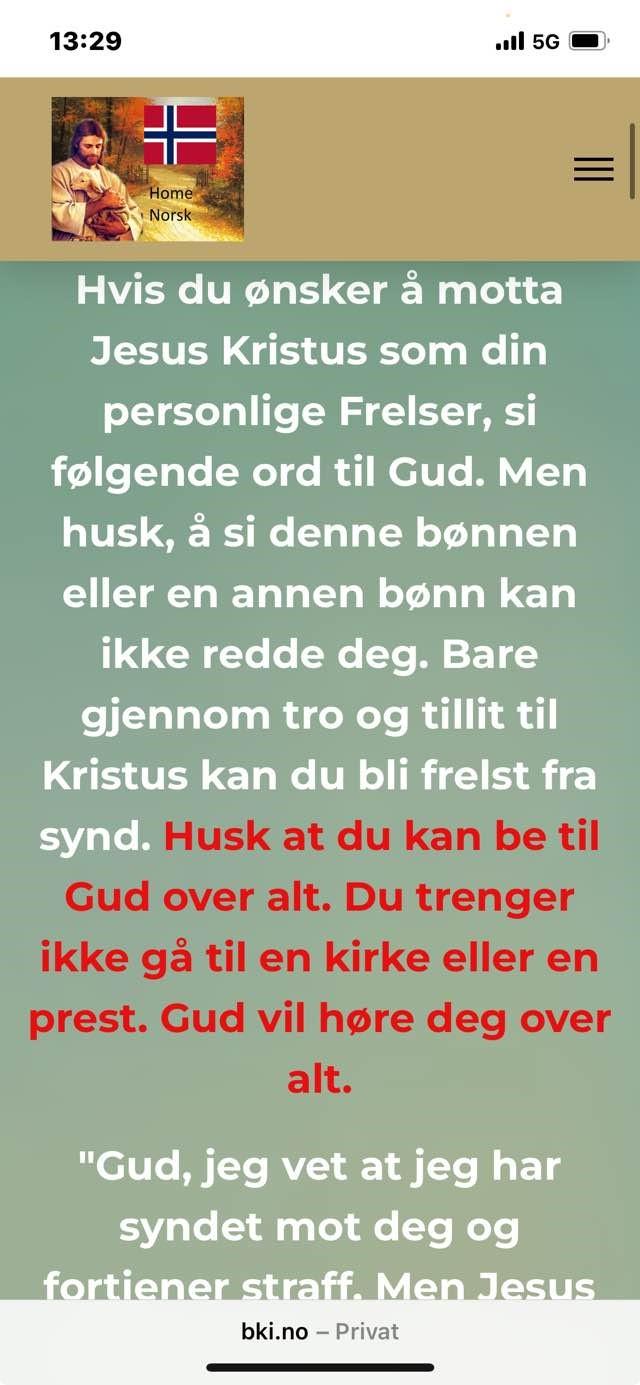Kjære Herre Jesus, kom inn i mitt hjerte. Tilgi meg mine synder. Rens meg Jesus, takk for at du døde for meg. Jeg tror at du har stått opp fra de døde og at du vil vende tilbake til meg. Takk for at du fyller meg med Den Hellige Ånd. Takk for at du er Herren i mitt liv nå. Amen