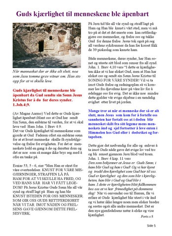 Både menneskene, deres synder, har Han sonet og utøste sitt blod som renser fra all synd. John. 1. Brev 4,10 vers "I dette er kjærligheten ikke at vi har elsket Gud, men at Han har elsket oss og sendt sin Sønn Jesus Kristus til SONING FOR VÅRE SYNDER! Vil vi ta imot Guds frelse og redningsplan så vi kommer løs fra djevelens krav på våre liv for å ødelegge oss for evig. Det er ikke noe mindre dette gjelder vår evige skjebne i en uendelig evighet etter livet på jorden. Mange tror at når et menneske dør så er alt slutt, men Jesus som kom for å fortelle oss sannheten har fortalt oss at i døden blir mennesket skilt fra sitt legeme mens menneskets ånd og sjel fortsetter å leve enten i Himmelen hos Gud eller i dødsriket og fortapelsen. Dette gjør det nødvendig for alle og enhver å ta imot Guds nåde gave det evige liv ved tro og bli renset gjennom Jesu blod ved troen. John. 1. Brev 4 kap. 11 vers Den som bekjenner at Jesus er Guds Sønn, i ham blir Gud og han i Gud! Og vi har kjent og trodd den kjærlighet som Gud har til oss. Gud er kjærlighet og den som blir i kjærligheten, han blir i Gud og Gud blir i ham. I dette er kjærligheten blitt fullkommen hos oss at vi har frimodighet på dommens dag! Når vi omvender oss til Herren, får vi erfare at Guds kjærlighet blir utøst i vår ånd og vi hater ikke lengre noen men elsker brødre og søstre også alle andre mennesket. Det er den nye gjenfødelsens natur å elske og vise kjærlighet. Forts.s.8 Side 5