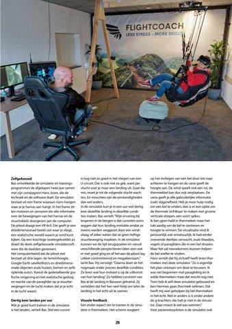 Zelfgebouwd Bas ontwikkelde de simulator en trainingsprogramma’s de afgelopen twee jaar samen met zijn compagnon Hans Joore, die de techniek en de software doet. De simulator bestaat uit een frame waaraan risers hangen waar je je harnas aan hangt. In het frame zitten motoren en sensoren die alle informatie over de bewegingen van het harnas en de stuurtokkels doorgeven aan de computer. De piloot draagt een VR-bril. Die geeft je een driedimensionaal beeld van waar je vliegt, een realistische wereld waarin je rond kunt kijken. Op een krachtige (watergekoelde) pc draait de deels zelfgebouwde simulatorsoftware die de beelden genereert. Het computerbeeld dat de piloot ziet bestaat uit drie lagen: de terreinhoogte, Google Earth satellietfoto’s en driedimensionale objecten zoals huizen, bomen en zelfs rijdende auto’s. Vooral de gedetailleerde grafische omgeving en het realistische gedrag en reactie van de paraglider op je stuurbewegingen en de lucht maken dat je je echt in de lucht waant.