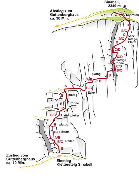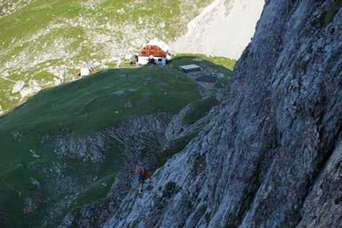 Onder: Klimmers in de Via Ferrata, het Guttenberghaus op de achtergrond.
