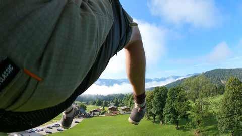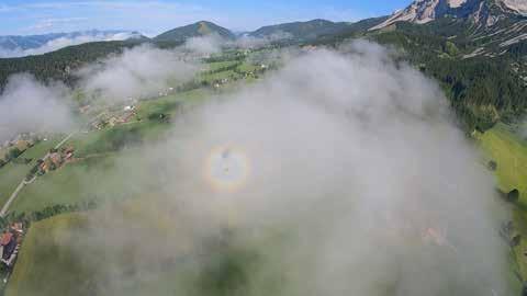 Zelf stond ik met mijn simpele trouwe singleskin op de Sinabell en om half tien in de ochtend ging het nog niet echt omhoog. In plaats van gletsjers kreeg ik een andere traktatie tijdens mijn vlucht. Het prachtige uitzicht met de optrekkende ochtendnevel als decor werd plotseling versierd met het Brockenspook. De schaduw van mij met mijn scherm, omgeven door een regenboogkleurige cirkel (glorie), geeft een magisch sfeertje aan dit mooie avontuur. Met ruim voldoende hoogte kun je landen naast de auto in het dorp Vordere Ramsau. In Schladming is nog een officiële landingsplaats, en mocht je richting de gletsjer van de Dachtstein vliegen kan de landingsplaats bij Rittisberg ook handig zijn. Zolang je netjes langs een weg en niet in hoog ongemaaid gras landt, krijg je meestal geen gedoe met de boeren.