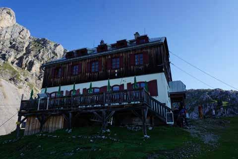 Boven: Guttenberghaus, klimmers maken zich klaar voor de Via Ferrata.