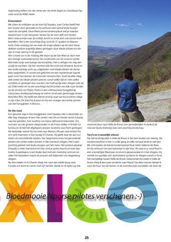 regelmatig bellen van zes meter per seconde tegen en cloudbase ligt vaak rond de 4000 meter. Droomstart We zitten te ontbijten op de start bij Tapalpa. Juan Carlos heeft hier een mooie start gemaakt en hij verhuurt een aantal leuke huisjes naast de startplek. Deze Mexicaanse tandempiloot tref je meestal slapend aan in zijn hangmat. Siësta! Op de start zelf runt hij een klein restaurantje waar je ontbijt, lunch en sinds kort ook pizza’s kunt bestellen. Het is een prachtige dag, rond de 27 graden en blauwe lucht. Ook vandaag zijn we weer de enige piloten op de start. Deze stekken worden eigenlijk alleen gevlogen door lokale piloten en die zijn er maar weinig in dit gebied. Het is twee uur in de middag. We staan op de San Marcos-start met een stevige zuidwestenwind. De combinatie van de wind en sterke thermiek zorgt voor lastige startcondities. Het is veiliger om nog een uurtje te wachten. Op het moment dat de wind wat afneemt, komt er een oude roestige pick-up, volgeladen met lokale piloten de startplaats opgereden. Er wordt wat gelachen en een mysterieuze sigaret gaat rond. Dan komen de schermen tevoorschijn. Zoals bij elke vliegstek weten de lokale piloten precies vanaf welke tijd en met welke condities er gevlogen kan worden. Een half uurtje later vliegen ook wij op 3500 meter en na een prachtige vlucht landen we vlak voor donker op de airstrip van Pedro. Pedro is een enthousiaste hanggliding instructeur, kinderpsycholoog en ziet er uit als een personage uit een Mad Max-film. Hij heeft een kleine airstrip waarvan hij tandems vliegt in zijn trike. Dit doet hij al jaren en hij was vroeger een echte pionier van het hanggliden in Mexico. On the road Een gewone dag in het vlieggebied rond Tapalpa. Het is december en elke dag vliegbaar. Ik ben hier samen met Jim en Derek vanuit Canada naartoe gereden. Een roadtrip van bijna vijfduizend kilometer. Jim runt een van de grotere vliegscholen in de Fraser Valley in British Columbia en ik heb het afgelopen seizoen tandems voor hem gevlogen. Als bedankje neemt hij me mee naar Mexico. Elk jaar overwintert hij zo’n drie maanden in het dorpje El Chante. Hij geeft daar les aan cursisten uit verschillende landen. Van beginnerscursus tot gevorderde piloten die verder willen komen in het overland vliegen. Het is een prachtig gebied met leuke dorpjes aan het meer. Het grotere plaatsje Chapala is meer toeristisch en hier vind je grote resorts en luxe Spahotels. Guadalajara is een leuke stad met een levendig centrum en zeker het bezoeken waard als je even wilt bijkomen van dagenlang vliegen. Na drie weken in El Chante vliegt Jim voor een week terug naar Canada om kerst te vieren met zijn familie. Derek en ik rijden op dat
