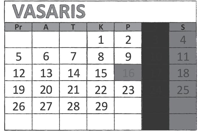 3. Internete susirask vasario mėnesio kalendorių. Sužinok, kokios dienos yra minimos vasarį. Išsirink dvi dienas ir jas apibrauk kalendoriuje. Jų pavadinimus įrašyk į lentelę.