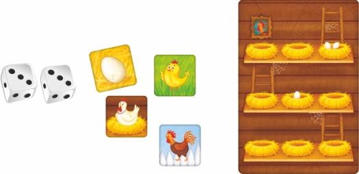 Žaidėjas ridena abu kauliukus iš karto. Jei ant abiejų kauliukų iškrito skirtingas taškų skaičius, žaidėjas gauna kiaušinius, viščiukus ir vištas tokiubūdu: