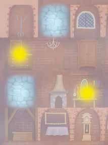 Kaskart, kai ėjimo pradžioje arba dėl burtažodžio nuo pamato laukelio nuimate kortą su tiesia rodykle, perkelkite visas vaiduoklio korteles kortoje nurodyta kryptimi. Vaiduokliai negali įžengti į laukelius su lobiu ir durimis. Jei vaiduoklio kelyje yra lobio ar durų kortelė, jis lieka stovėti savo vietoje. Tačiau vaiduoklis gali pereiti per menių sienas, t. y. jei kuris nors vaiduoklis turi išeiti už žaidimo lauko ribų, jis grįžta į žaidimo lauką iš priešingos pusės: jei išeina žemyn, tai grįžta iš viršaus, ir atvirkščiai, o jei išeina į kairę, tai grįžta iš dešinės, ir atvirkščiai.