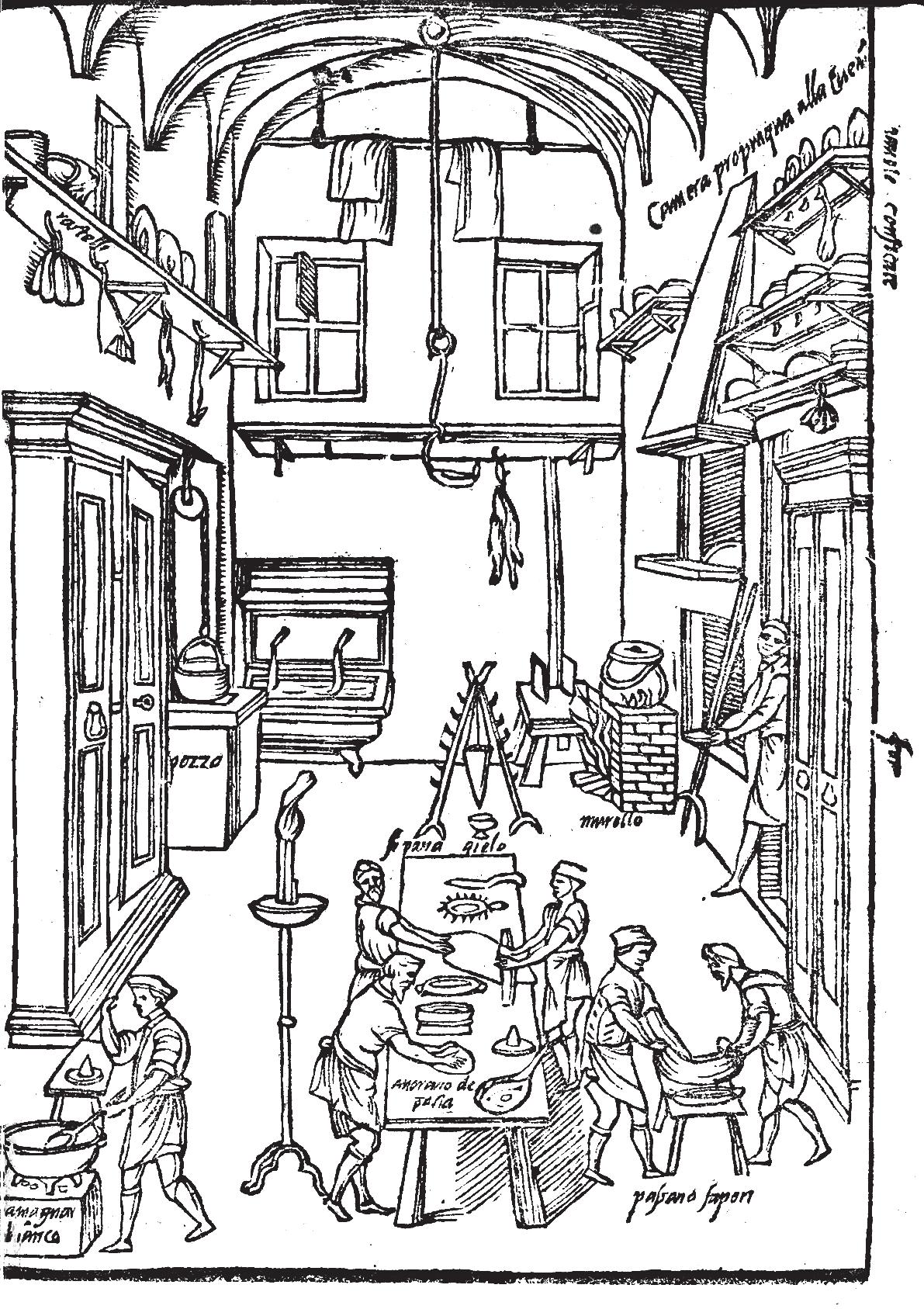 Į XVI a. Italijoje užvirusią tobulos virtuvės įrengimo diskusiją įsitraukė ir virėjai. Ypač aktualus tapo popiežiaus Pijaus V šefo Bartolomeo Scappi (1500?–1577)31 veikalas Opera di Bartolomeo Scappi, mastro dell’arte del cucinare (Maisto gaminimo meno meistro Bartolomeo Scappi veikalas), pasirodęs 1570 m. Venecijoje. Gausiai iliustruotas leidinys Europoje imtas laikyti nepakeičiamu, o įtaką darė net XVII amžiuje. Pakartotinių leidimų būta iki 1643 m., kitomis kalbomis – ir XVII a. antroje pusėje. Autorius ragino tobulinti virtuvės įrangą, naudoti įvairius virtuvės prietaisus32. Pirmoje (iš šešių) knygos dalyje kalbama apie virtuvės įrangą ir įrankius. Graviūroje (1 pav.) vaizduojama ideali XVI a. antros pusės virtuvė: galinėje sienoje įrengtas židinys su dūmtraukiu ir dviem pasukamaisiais puodų laikikliais, už apsauginės širmos sėdintis virėjas suka ant iešmo zuikį, dešinėje pusėje prie sienos yra mūrinė viryklėlė (it. murello, pranc. potagers) su penkiomis kaitvietėmis, skirta virti lėtai ant žemos temperatūros. Virš mūrinės viryklėlės įrengta spintelė, o kampe kabo krepšys įrankiams. Kairėje patalpos pusėje – gaubtas ir plautuvė su tekančiu vandeniu. Antroji patalpa (2 pav.) skirta patiekalams ruošti. Kairėje