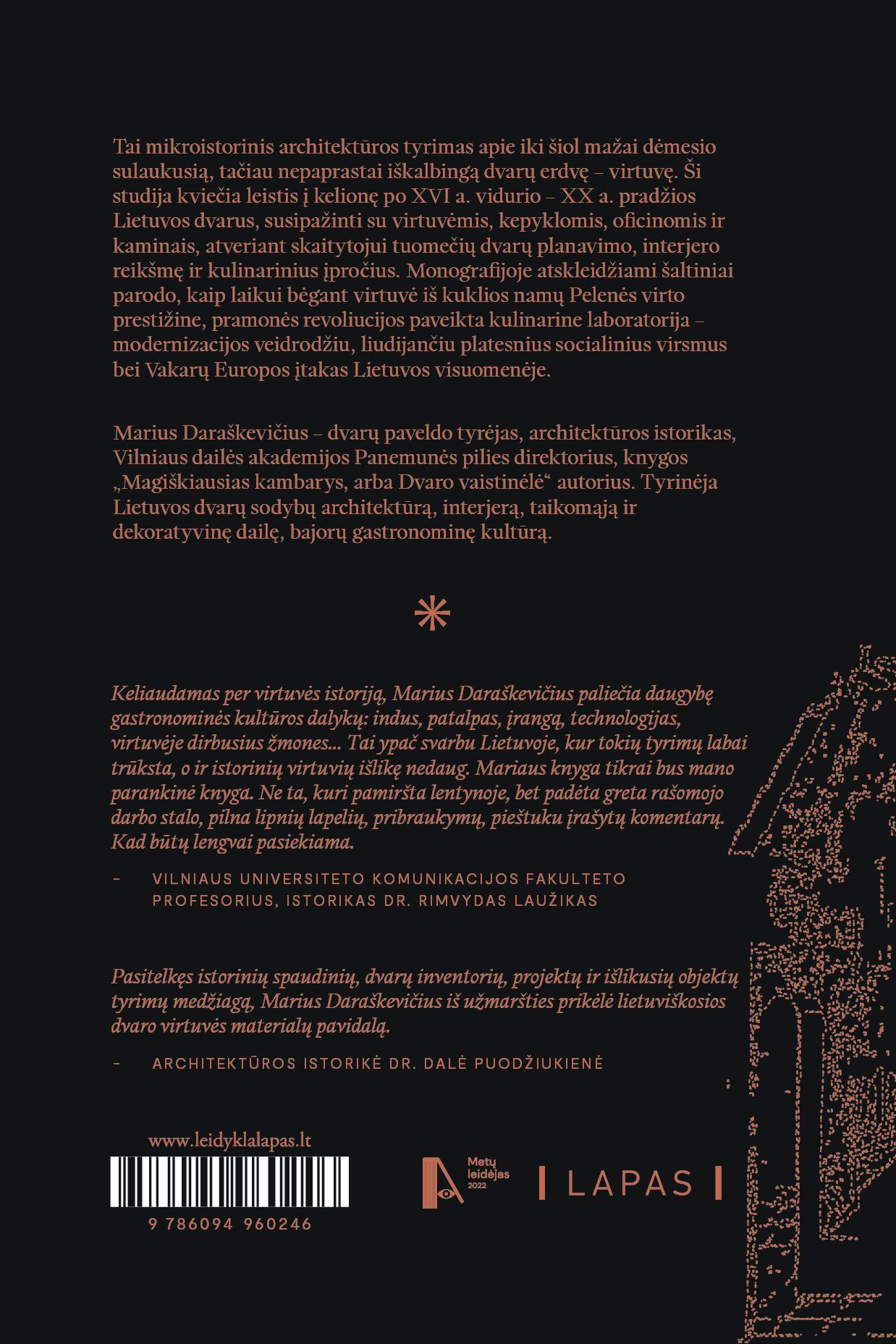 Mano daktaro disertacijos tyrimas buvo skirtas dvaro rūmų valgomojo kambariui. Tačiau pateikti visuminį vaizdą apie dvarų valgymo kultūrą, neištyrus maisto gamybos erdvės, neįmanoma. Tam ir pasiryžau istorikės Redos Griškaitės paskatintas neapsiriboti valgomojo tyrimu bei tęsti jį maisto ruošos zonoje – virtuvėje. Tiesa, pakeliui gimė studija „Magiškiausias kambarys, arba Dvaro vaistinėlė“ (Lapas, 2021). Tad ši skaitytojui pristatoma knyga pratęsia specifinių dvaro erdvių tyrimus, joje gilinamasi į didikų ir stambių dvarų virtuvės erdvę – ir kaip atskirus pastatus, ir kaip specialią zoną rūmuose. Šios monografijos tikslas – dvarų modernėjimo procesų XVI a. vidurio – XX a. pradžios kontekste rekonstruoti Lietuvos didikų ir stambių bajorų virtuvės architektūrą, pastato struktūrą ir vaizdą, jos įrangą ir inventorių. Monografijoje pasitelkiami dvarų tyrimuose menkai naudoti ar visai nežinomi šaltiniai bei literatūra. Naujai surasti duomenys ir jais remiantis padarytos įžvalgos, tikimasi, paskatins geriau suprasti dvaro erdvių planavimo, interjero įrangos, elementų prasmes ir svarbą, juos pasirinkusių dvarininkų ir architektūros projektuotojų intencijas.