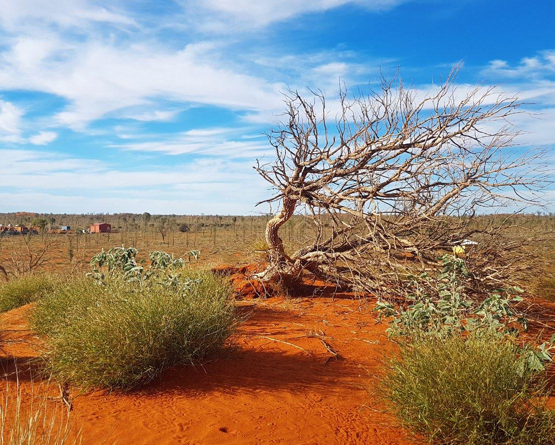 Krūmokšniai – kartais nedideli, dailūs, apvalaini, o kartais – didesni, netvarkingi, išsidraikę. Kai kurie žali, o kiti sudžiūvę į stagarus – stypso čia pavieniui, čia susispietę krūvomis. Kai kurie išsikeroję į didesnius krūmus, brūzgynus, kuriuose koks nors oranžinės spalvos Australijos vilkas – vadinamasis dingo – gali mėgautis pavėsiu. Suleidę šaknis į raudoną smėlio jūrą stūkso medžiai, nors juos gal geriau vadinti medeliais, mat jie vos didesni už brūzgynus ir atrodo tokie leisgyviai. Matosi, kad neseniai čia praūžta gaisro, tad iš kai kurių medžių likę tik pajuodavę stagarai. Bet jie priklauso tiems ištvermingiesiems. Jų juodi kamienai, nors nulaižyti liepsnų, tuoj irgi pasipuoš žaliomis dekoracijomis – naujais ką tik išsprogusiais lapeliais.
