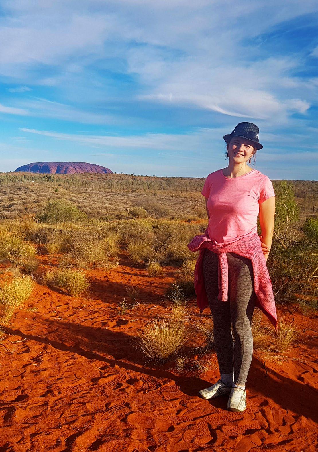 Bevaikštinėdama po raudonas kopas, tolumoje, viduryje nesibaigiančių lygumų, pamačiau rožinį Uluru uolyną, skleidžiantį rimtį ir ramybę. Kalnas buvo ne raudonas ar oranžinis, o rožinis –jei būtų kas parodęs nuotrauką, būčiau pagalvojusi, kad tai specialieji efektai. Pasirodo, Uluru keičia spalvas priklausomai nuo paros laiko ir nuo oro. Geriausia jo spalvų kaitą stebėti leidžiantis saulei.