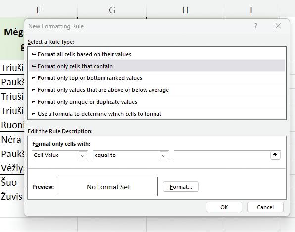 3. Spustelėk formatavimo mygtuką ir nurodyk, kaip turi būti apipavidalinti langeliai, kurių duomenys atitinka taisyklę.