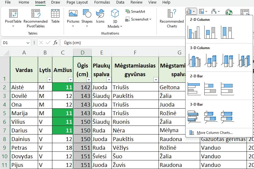3. Pasirink duomenis: spustelėk kairįjį pelės mygtuką ir pažymėk stulpelius „Vardas“ ir „Lytis“ (arba kitus stulpelius, pagal kuriuos nori kurti diagramą, pavyzdžiui, „Vardas“ ir „Mėgstamiausias gyvūnas“).