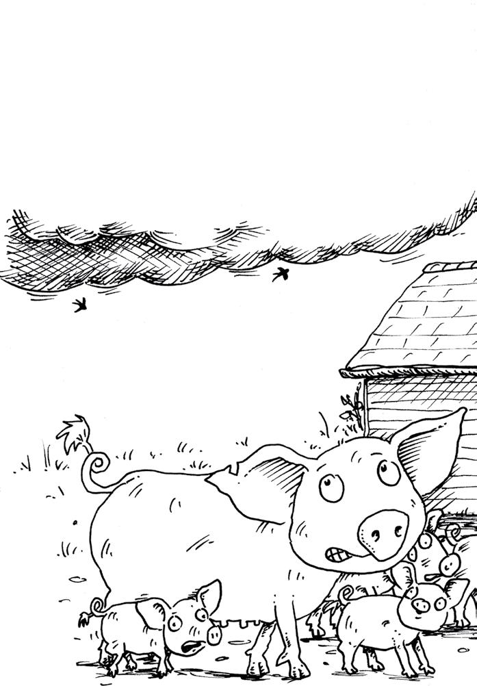 Paršė, didelė rožinė kiaulė, knyslinėdama po ūkio kiemą su dešimčia savo mažų paršelių, irgi šį tą išgirdo. Ji pažvelgė į dangų. – Man nepatinka, kaip atrodo dangus, – sukriuksėjo ji. – Nei kokie garsai iš jo sklinda.