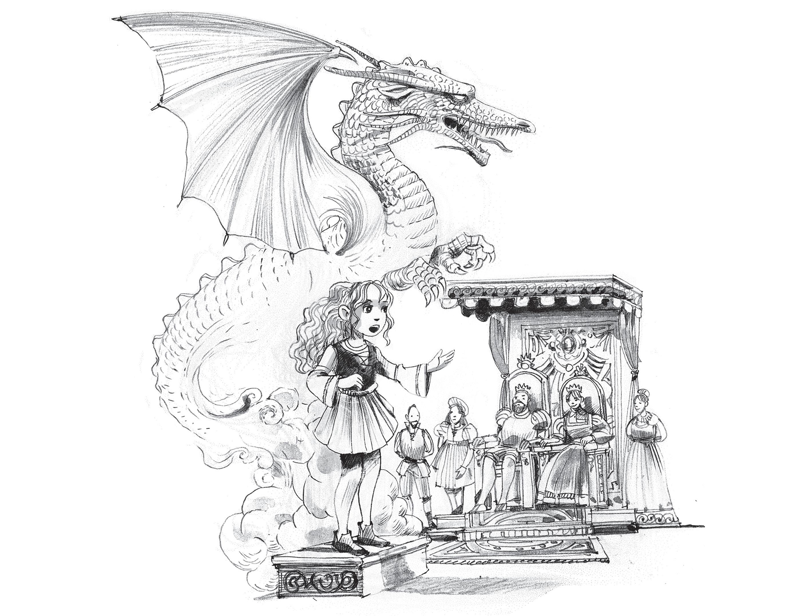 – O! – aiktelėjo susirinkusi minia. – Vargšas drakonas! Vargšė princesė! Žmonės nusijuokė, kumšėdami vienas kitą pečiais. Violeta kilstelėjo antakį ir pasakojo toliau: – Princesė gyveno tolimoje karalystėje, ir jie niekada nebuvo susitikę. Matote, drakonai panorėję gali visą pasaulį apžvelgti iš pusiaukelės ir mažiau kaip per dieną perskristi visą veidrodinį dangų. Tačiau paprastai jie taip nedaro, – ji sučiaupė lūpas. –Drakonai siaubingai tingūs.