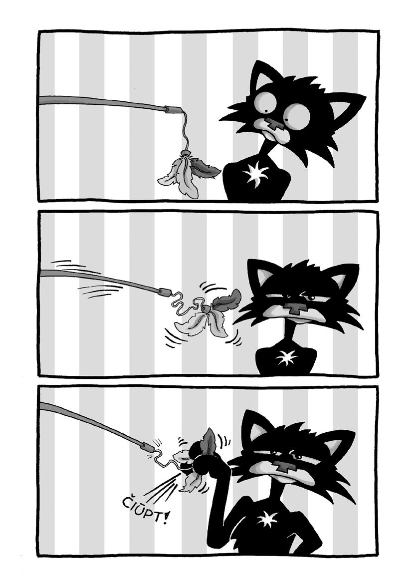 Katyte, gaudyk plunksnas! Čiupk jas! Kertu lažybų, kad tau nepavyks! Nieku gyvu nesugausi!