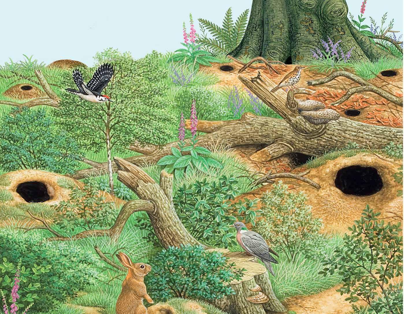 Didelę sausumos dalį dengia miškai ir girios. Vidutinių platumų miškus daugiausia sudaro plačialapiai miškai, rudenį metantys lapus. Nukritę lapai suyra, sudarydami skalsų, storą dirvožemio sluoksnį, kuriame tarpsta gyvybė ir kuris teikia puikią buveinę visų rūšių rausiantiems gyvūnams.