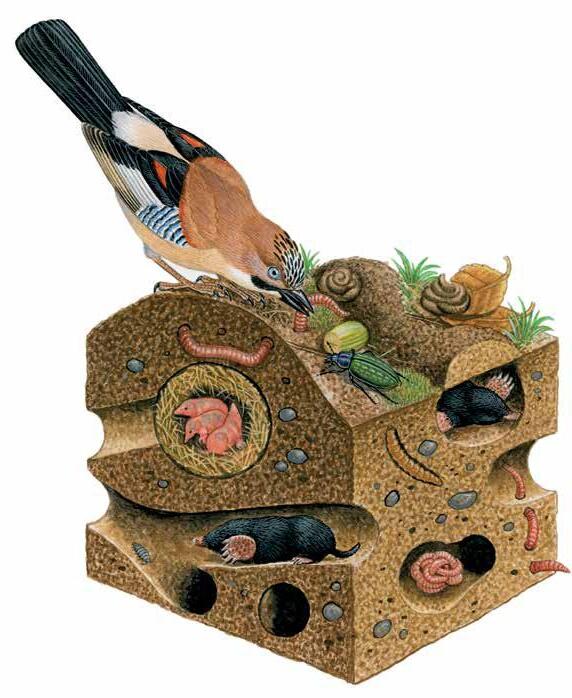 Paukščiai, kaip šis eurazinis kėkštas, ieško lesalo žemės paviršiuje, o štai darbštuolis kurmis kruopščiai rausia tunelius, saugančius jį nuo priešų. Į kurmio urvus pakliūva grobis, juose galima saugiai auginti jauniklius.