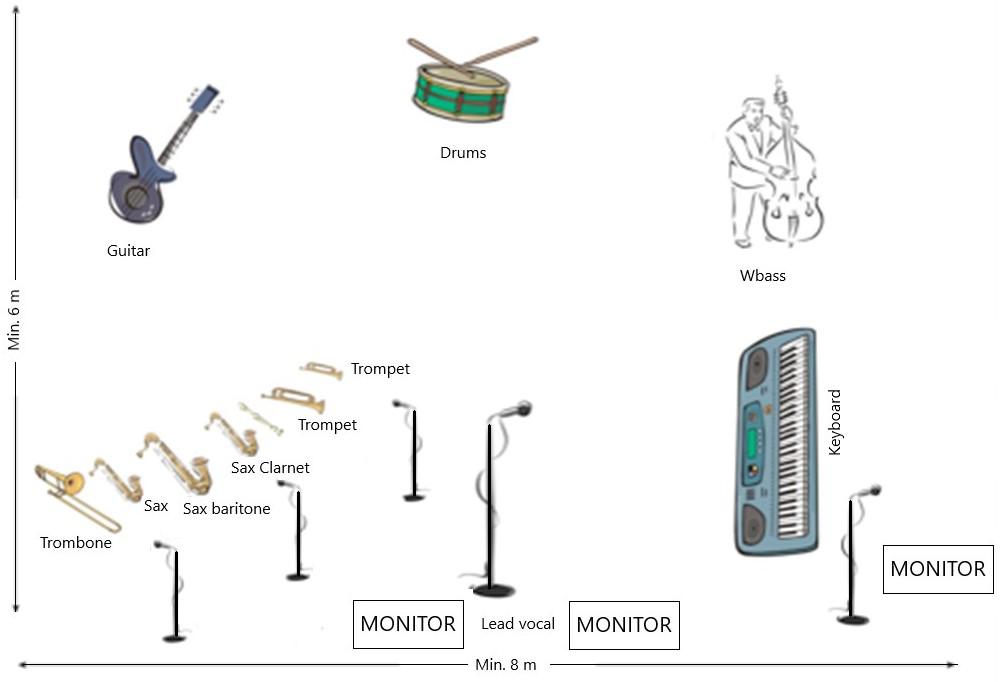 1.2 pav. „ Makchu Pikchu“ techninių reikalavimų protokolas, 2015 m. Minimalus scenos dydis – 4×6 m (šaltinis: https://www.stageplot.com/ )