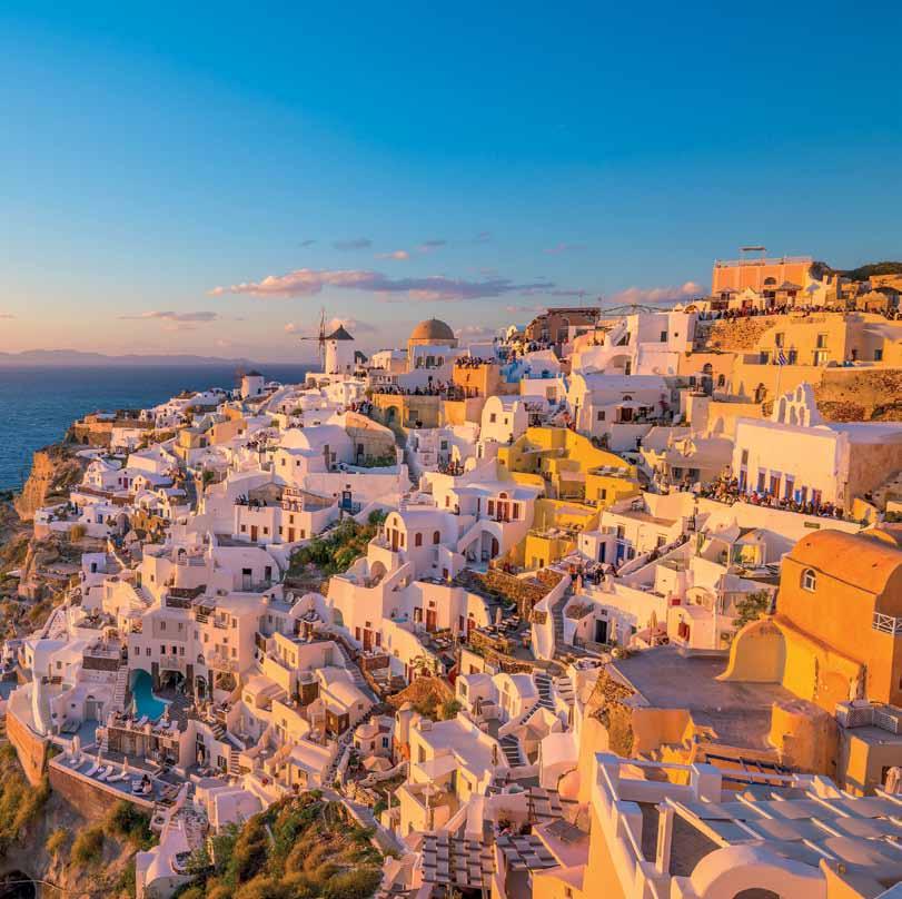 Nepakartojama atvykti į Santoriną (Terą) laivu. Iš pradžių patenkate į ugnikalnio kalderą, viso šio grožio ištakas. Iš tiesų sala susiformavo prieš 3500 metų išsiveržus ugnikalniui. Unikalus ir iš kitų archipelago salų išsiskiriantis – čia vyrauja juodi vulkaninės kilmės akmenys – Santorinas plyti ant didžiulės tektoninės plokštės. Žemė gali drebėti ir dar kartą, visgi tikimasi, kad daugiau nebus tokio didelio sprogimo kaip 1500 m. pr. Kr., kai salos centre atsivėrė plyšys, o garsas buvo girdėti už tūkstančių kilometrų. Dūmai temdė dangų dienų dienas, o žemės drebėjimas ir bangos buvo tokie galingi, kad, kai kurių tyrėjų nuomone, sugriovė Kretą ir sužlugdė Minojo civilizaciją. Esą todėl nuo tos akimirkos Egėjo salų kontrolė perėjusi į Mikėnų rankas – mitinių Homero apdainuotų herojų žinion.