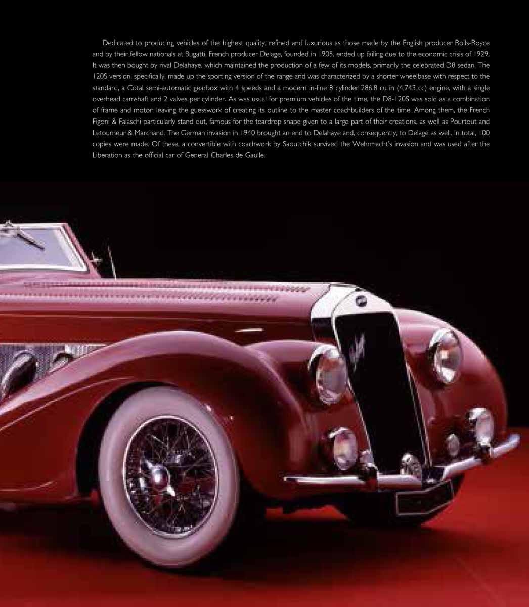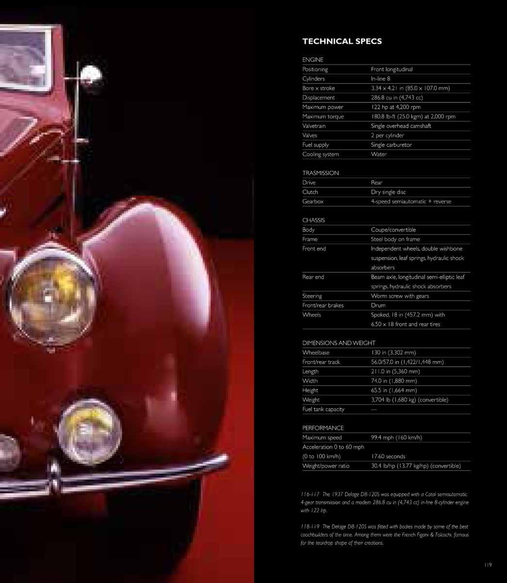 118–119 p. Modeliui „Delage D8-120S“ kėbulus kūrė geriausi to meto gamintojai. Tarp jų buvo tokie kolektyvai iš Prancūzijos kaip „Figoni & Falaschi“, išgarsėję dėl automobiliuose naudotų lašo formos detalių.